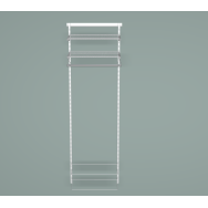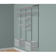 Duży kompletny system garderoby INTEGRI 1850×2000mm: 4 listwy, 16 wsporników, 10 półek, 6 koszy mesh, drążek, 4 półki na buty. 54 elementy.